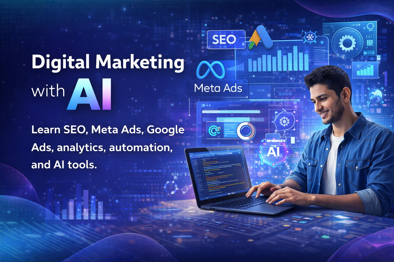 Learn SEO, Meta Ads, Google Ads, analytics, automation, and AI tools to plan, execute, and optimize high-performance marketing campaigns.