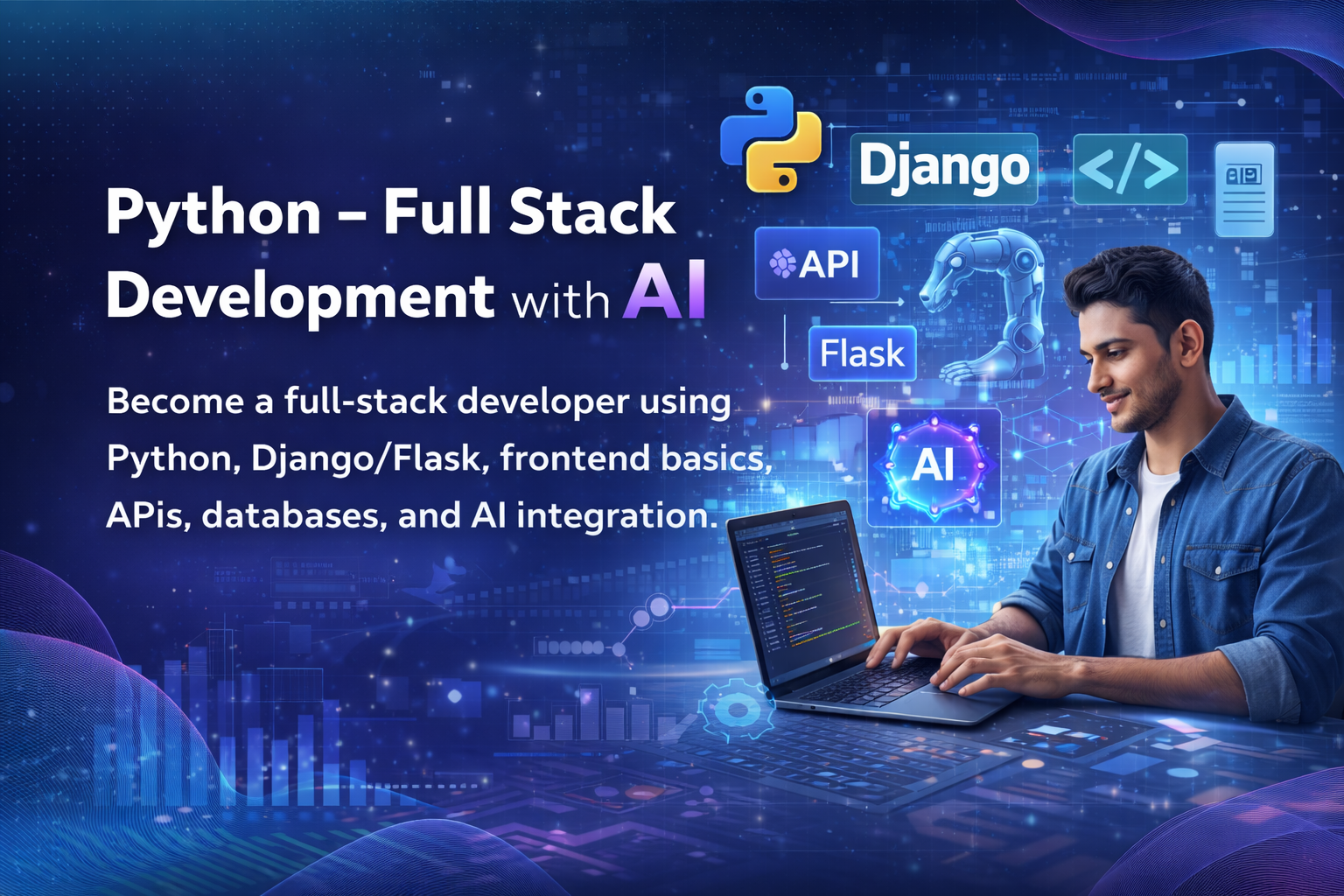 Become a full-stack developer using Python, Django/Flask, frontend basics, APIs, databases, and AI integration in web apps.