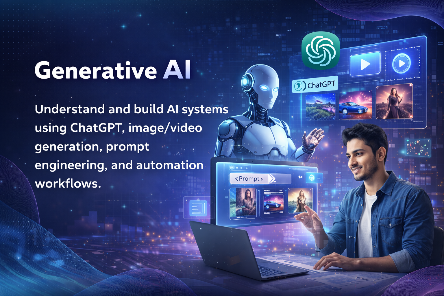 Understand and build AI systems using tools like ChatGPT, image/video generation, prompt engineering, and AI automation workflows.